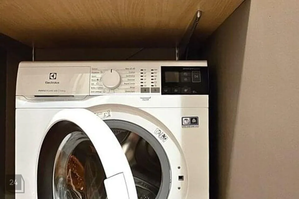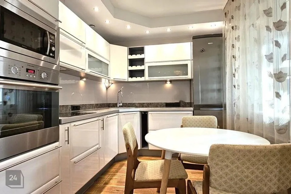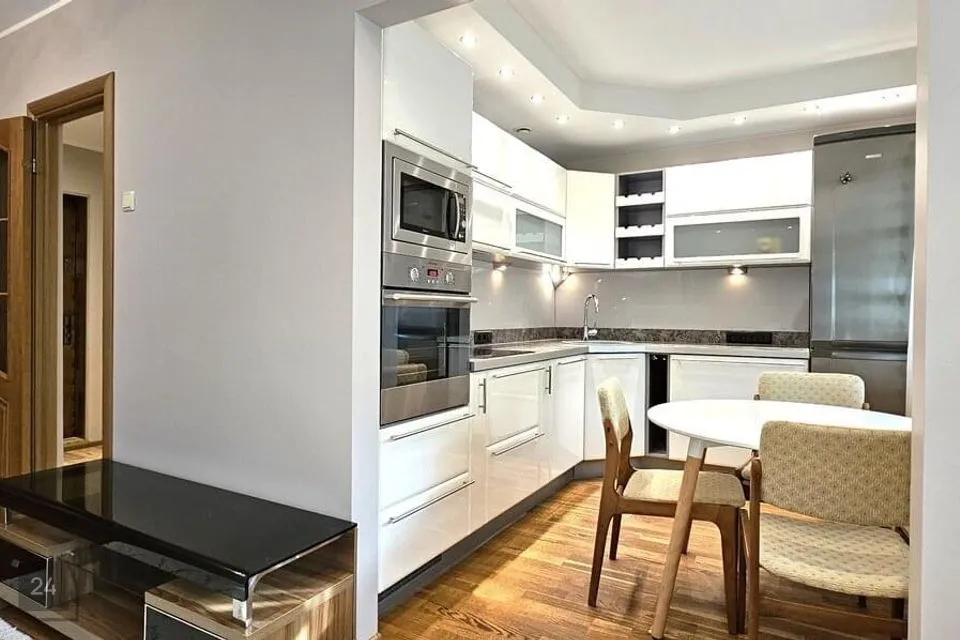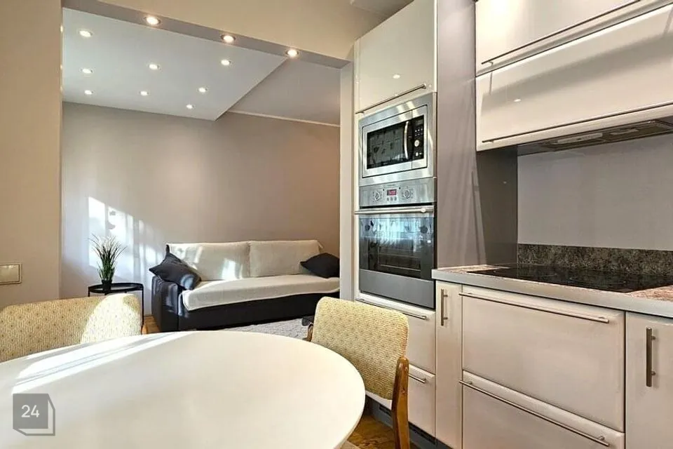 Korter olesmas sisseehitatud köögimööbel integreeritud tehnikaga: nõudpesumasin (60 cm), ahi ja pliit, õhupuhasti ja külmkapp.
