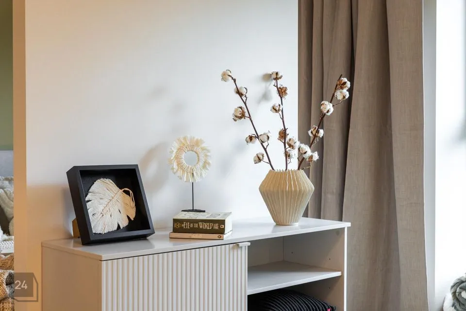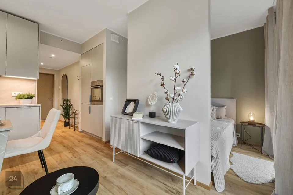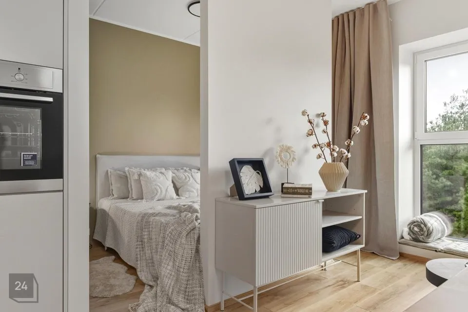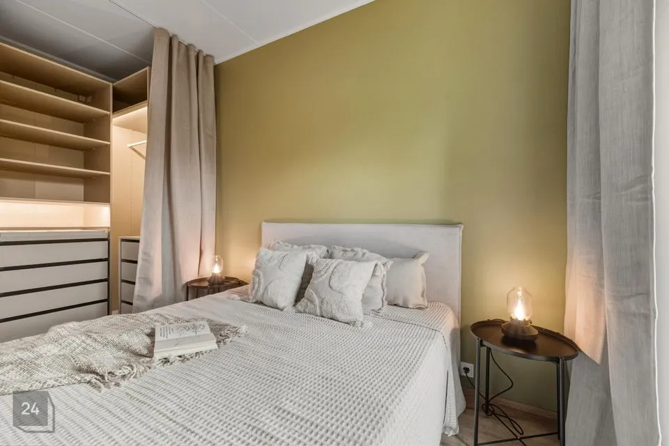 Nutika ruumiplaneeringu lahendusena on ehitatud 1-toalisesse korterisse kergvaheseinad, mille tulemusel on tekitatud privaatsem magamistoa osa ja valgustusega walk-in garderoob. Läbimõeldud planeering annab elanikele justkui 2-toalise korteri funktsionaalsuse. Mõnusalt laia kaheinimese voodi all on täiendavad panipaigad. Nii magamistoa kui ka elutoa kardinad on täispimendavad.