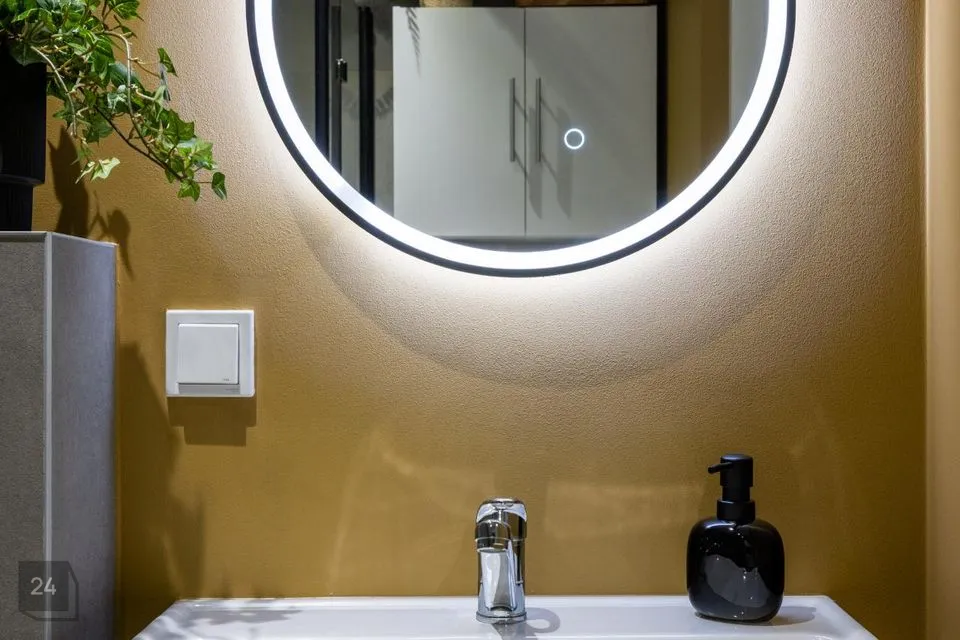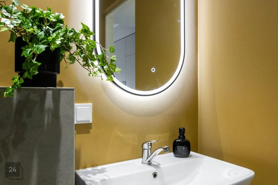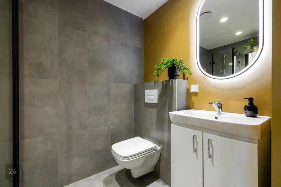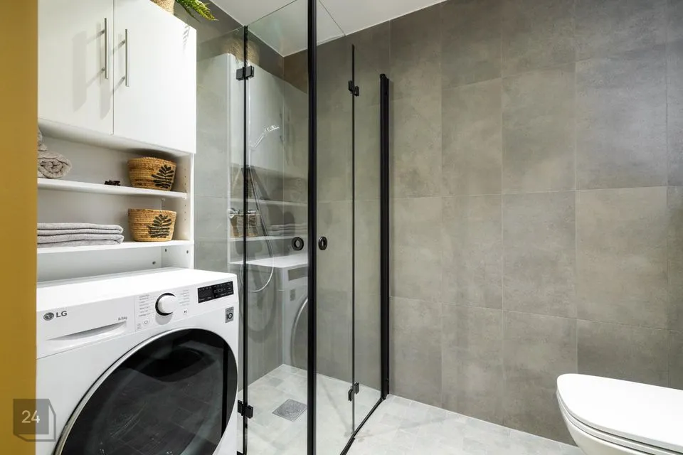 Esikus seistes paremat kätt asub vannituba, mis on koos tualettruumiga ja kus asub ka 2in1 kuivatusfunktsiooniga pesumasin.