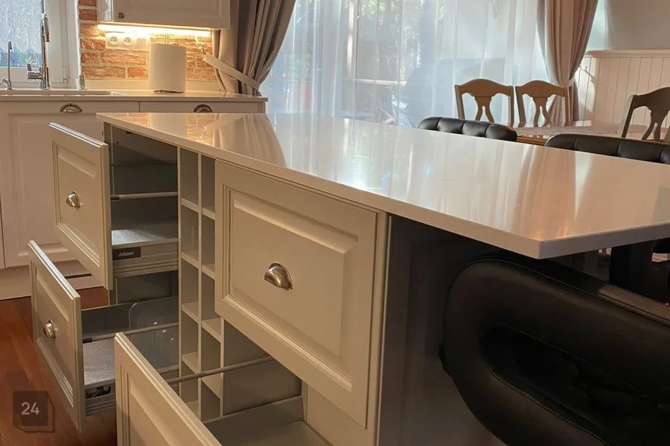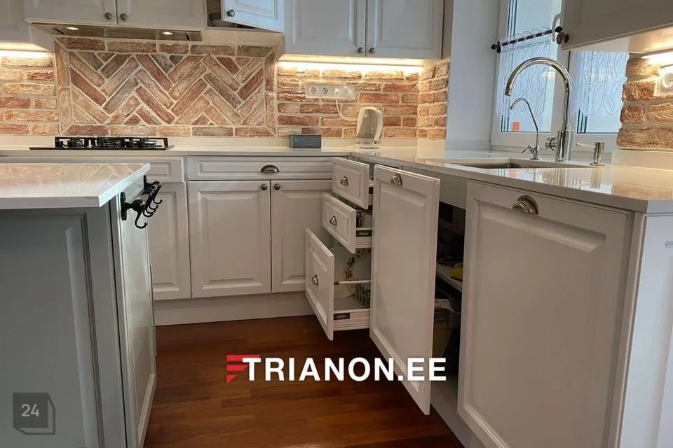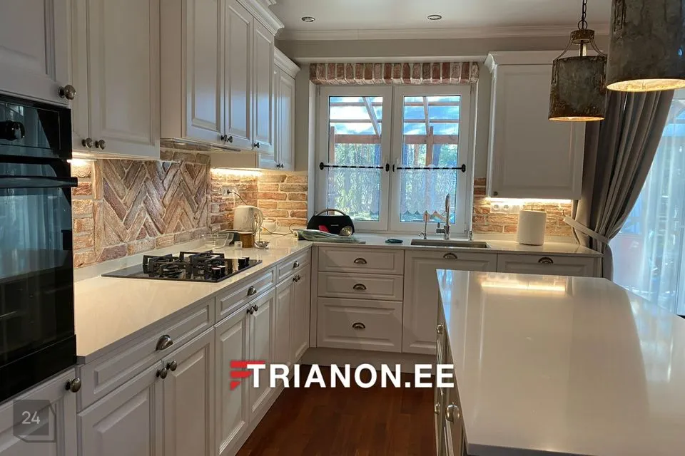 Köögiala: Täispuidust mööbel, kvartskivist töötasapind ja köögisaar, karastatud klaasist seinapaneel