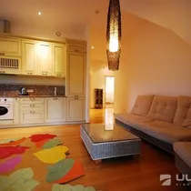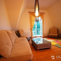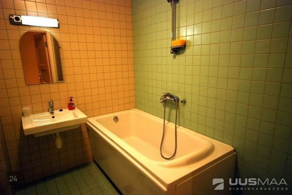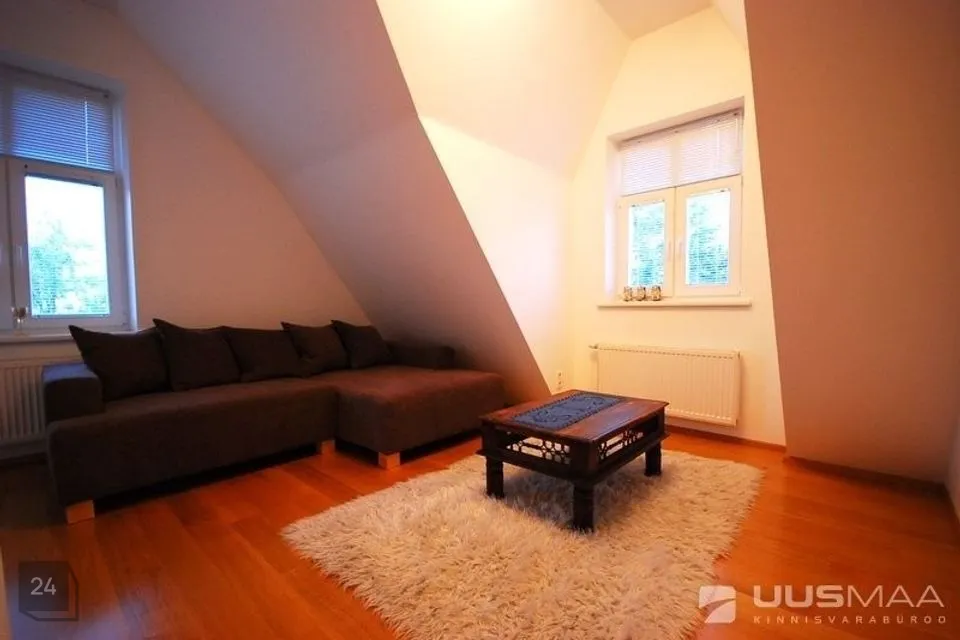Korteris tammeparkett, tammespooniga vaheuksed, kõrged laed, köögimööbel, wc ja vannituba on koos.