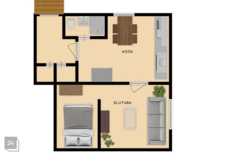 Eluruum koosneb esikust (ainult kahe pere kasutuses), köögist, vannitoast ning elutoast/magamistoast.