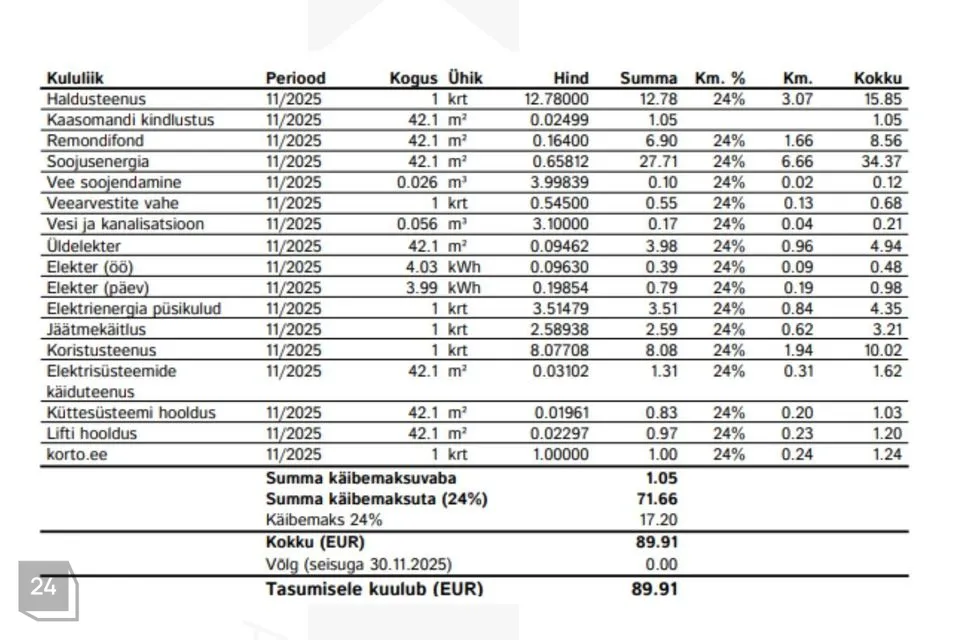 Lepingu sõlmimisel tuleb tasuda ühe kuu üür 500€, tagatisraha 700€ ja maakleritasu 500€.