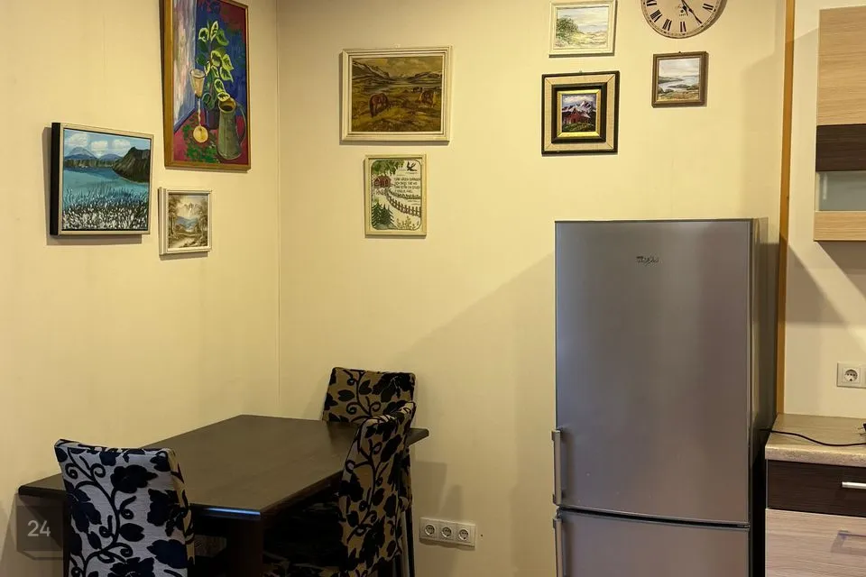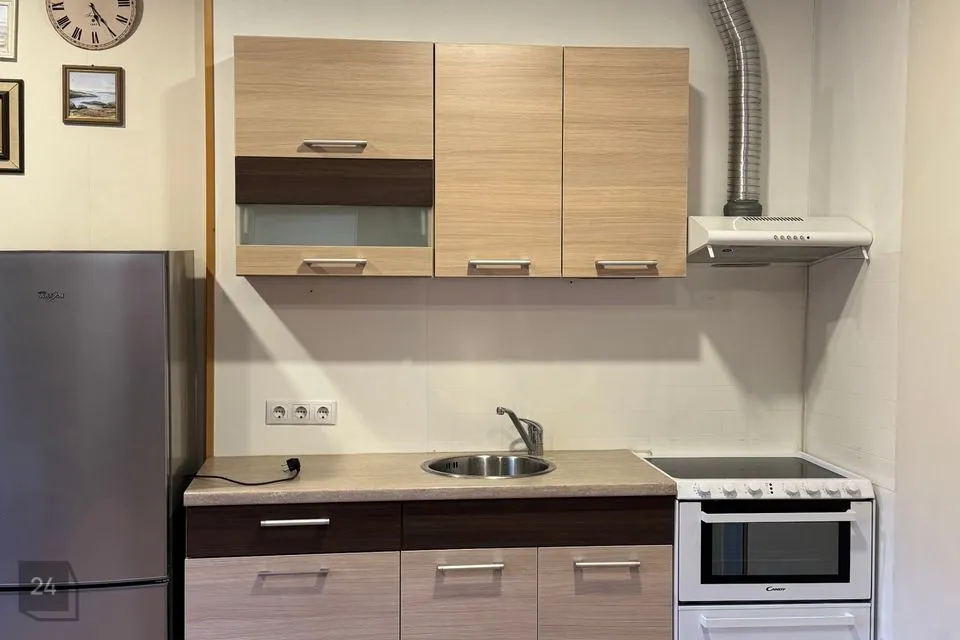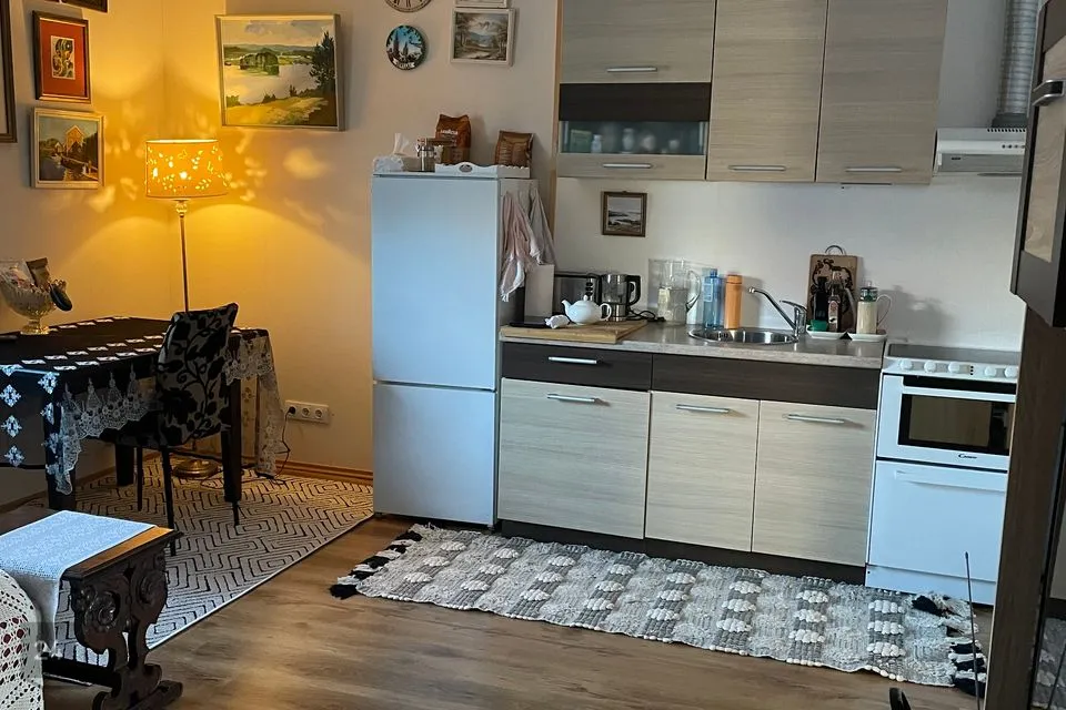 Elutuba-köök: diivanvoodi , söögilaud, 4 tooli, köögimööbel, külmik, pliit, ahi, kubu, TV puhvetkapp.