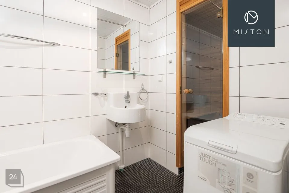 Korter on varustatud vajaliku köögitehnikaga. Vannitoas on mõnus vann, kus lõõgastuda peale pikka päeva. Lisaks on korteris ka saun, kus saate nautida kuuma leili. Nii elutoast kui ka magamistoast pääseb klaasitud rõdule, kus saate nautida hommikukohvi või õhtust päikeseloojangut.
