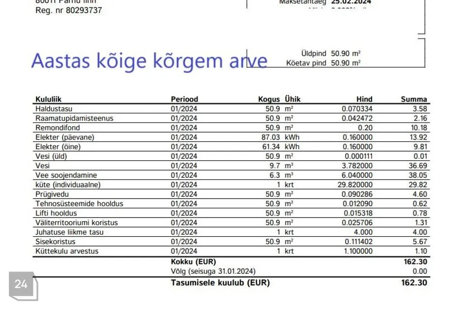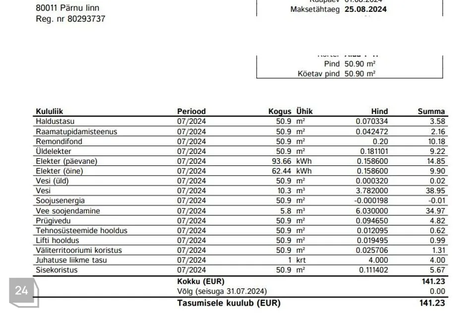 Esmamakse ühe üürikuu ettemaks 460 €, tagatisraha 460 € ja vahendustasu 360 €.
