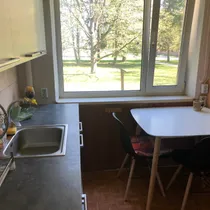 Korter on läbi maja planeeringuga, igast aknast avaneb kaunis vaade. Hommikul tõuseb päike köögiakna poolt ja õhtul loojub elutoaakna poolde.