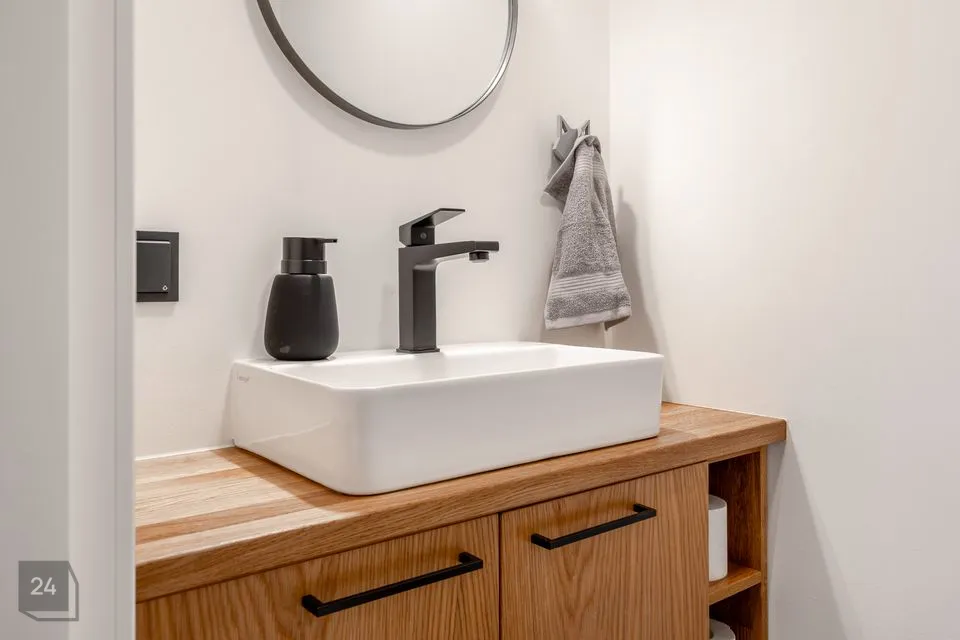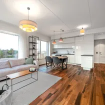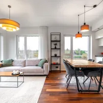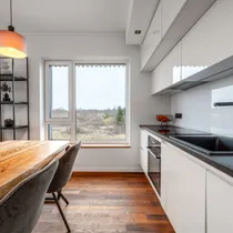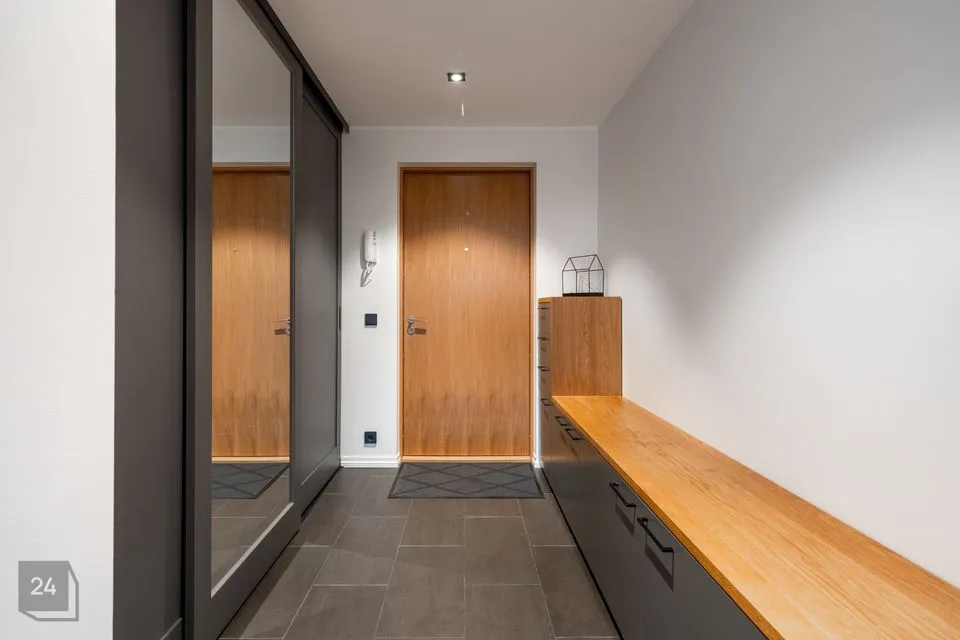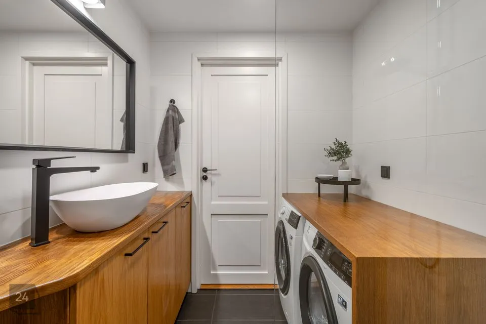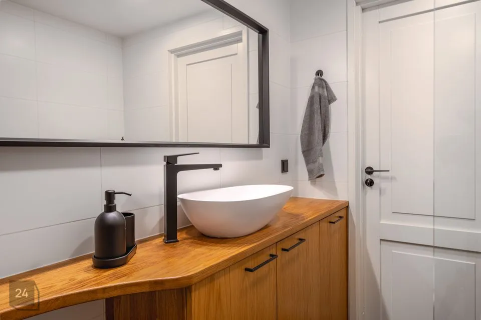 Korter on sisustatud kvaliteetselt ja maitsekalt, kasutades täispuidust eritellimusmööblit ja looduslikke materjale.