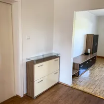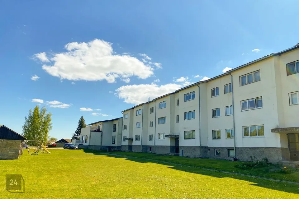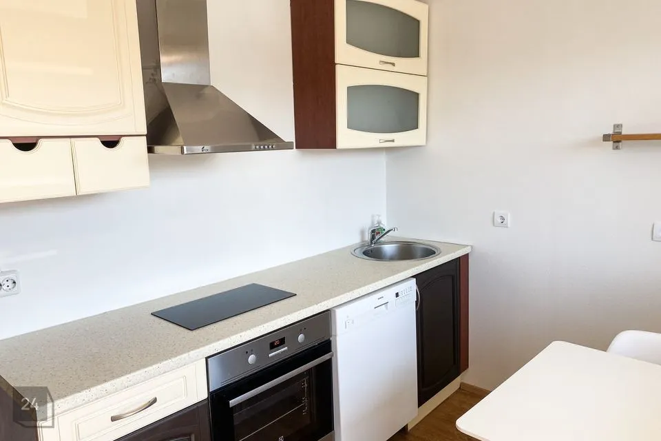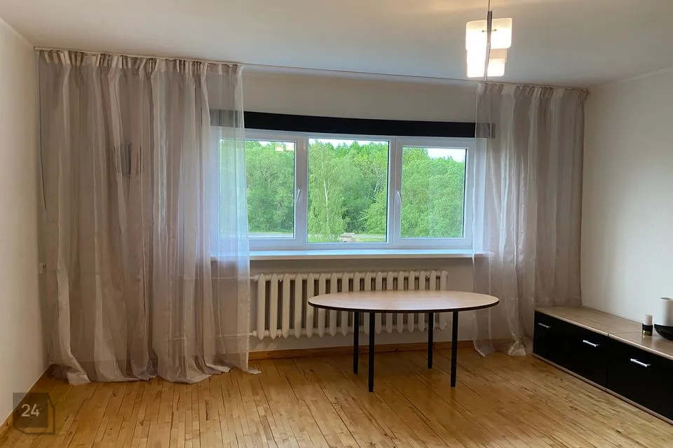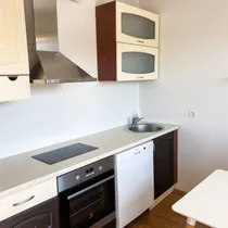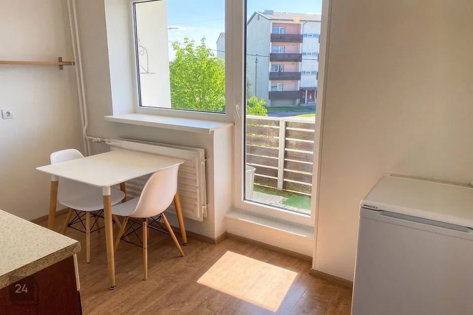 The apartment is partially furnished: kitchen furniture, dining table, bed, and other essentials are available.