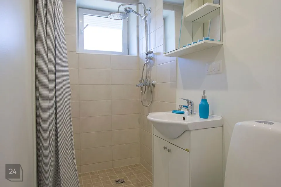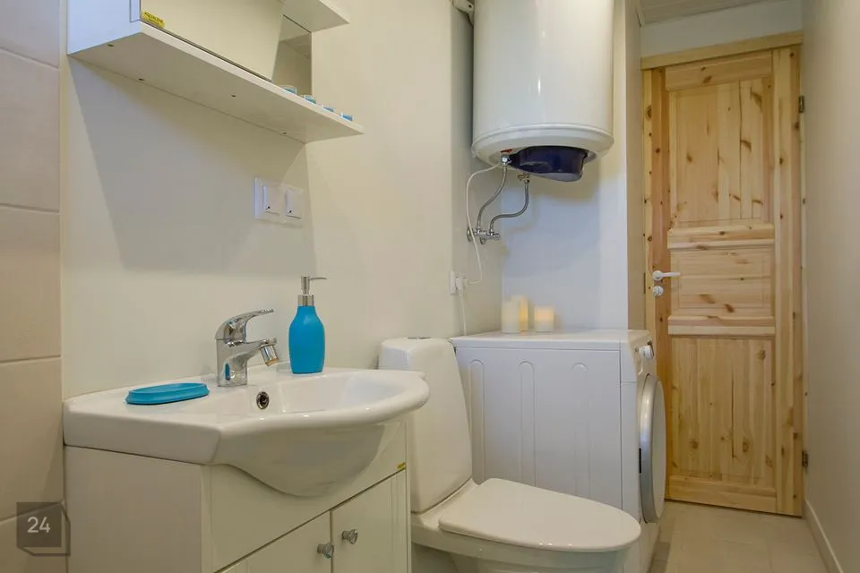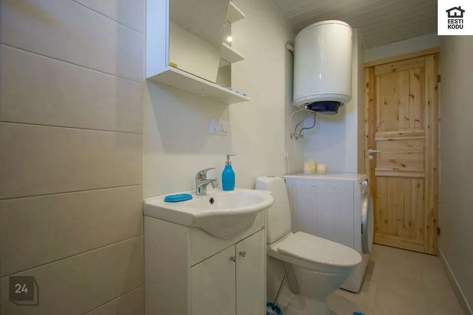 * Pesuruumis pesumasin, sanitaartehnika, valamukapp, dušisegisti, sundventilatsioon, reguleeritav põrandaküte ja puidust uks.