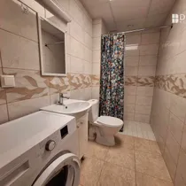 Vannitoa sisustus, pesumasin. Toas voodi jne.