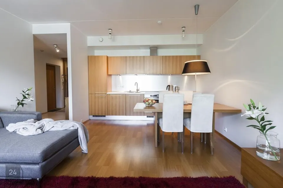 Avatud planeeringuga köök ja avar elutuba, ideaalne nii külaliste vastuvõtmiseks kui ka perega aja veetmiseks.