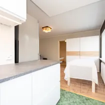 Einestada saab suure elutoas laua ääres, kuna korter koosneb avatud köögist.