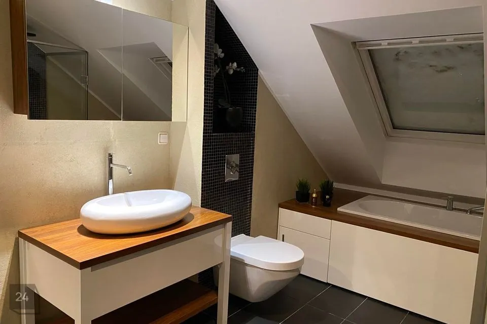 Vannitoas eritellimusel mööbel koos pesumasinaga, vann ja duzz.