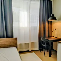 Olemas kõik eluks vajalik. WC, vann, pesumasin, miniköök, mööbel. Olemas internetiühendus. Naabrid viisakad ja vaiksed. Maja lähiübruses olemas bussipeatus, rongipeatus, kaubanduskeskus,