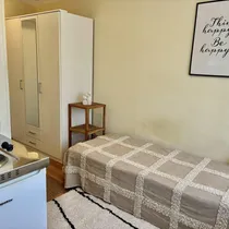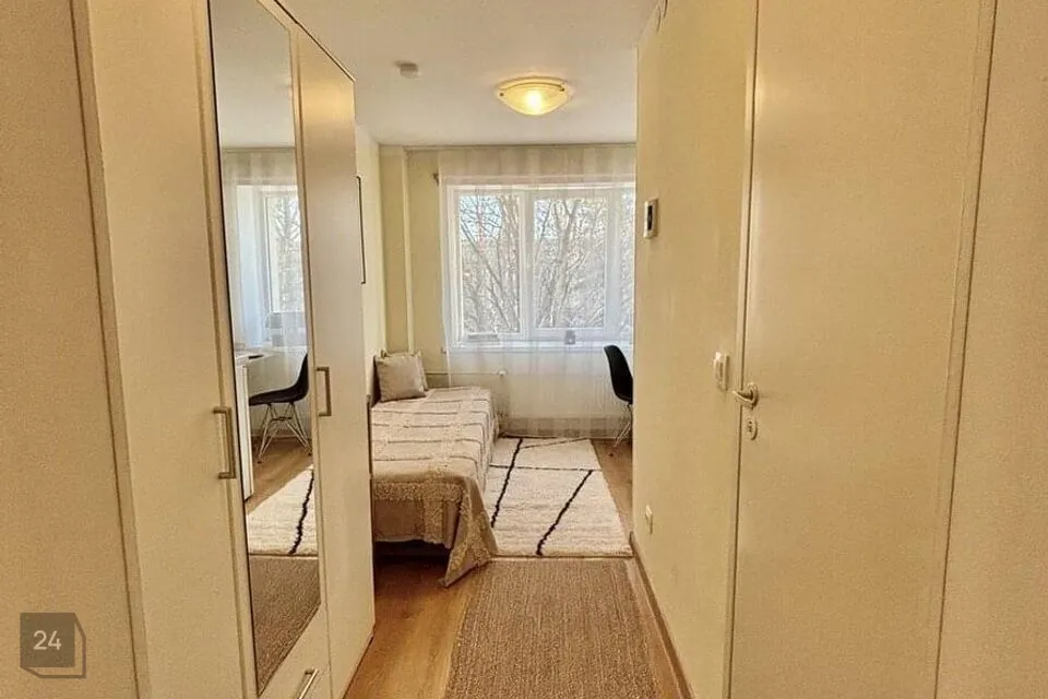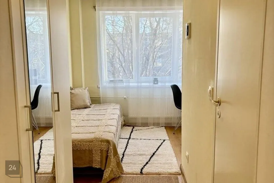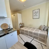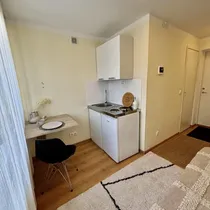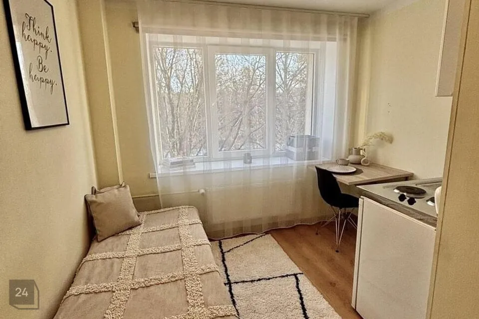Korter on sisustatud mööbliga: voodi (80x200), riidekapp, laud + tool, köögimööbel koos pliidi ja külmikuga.