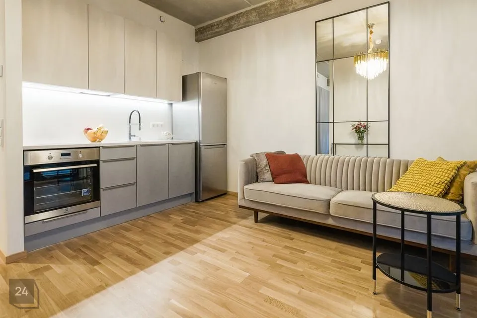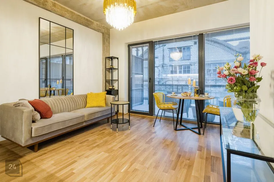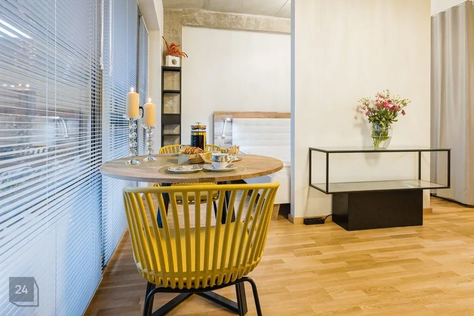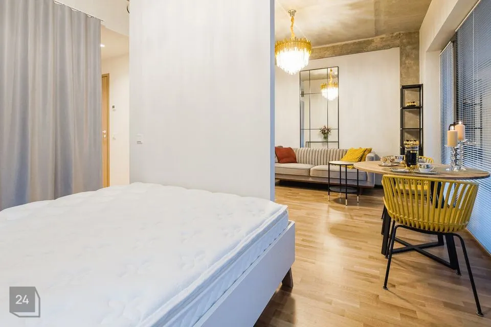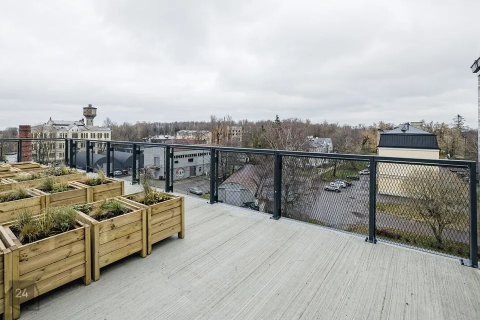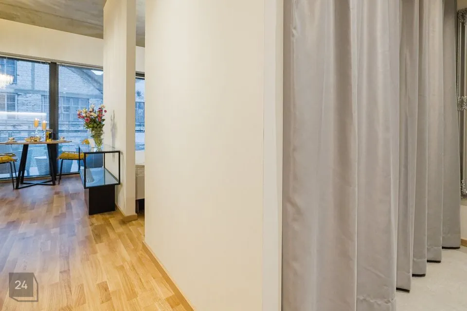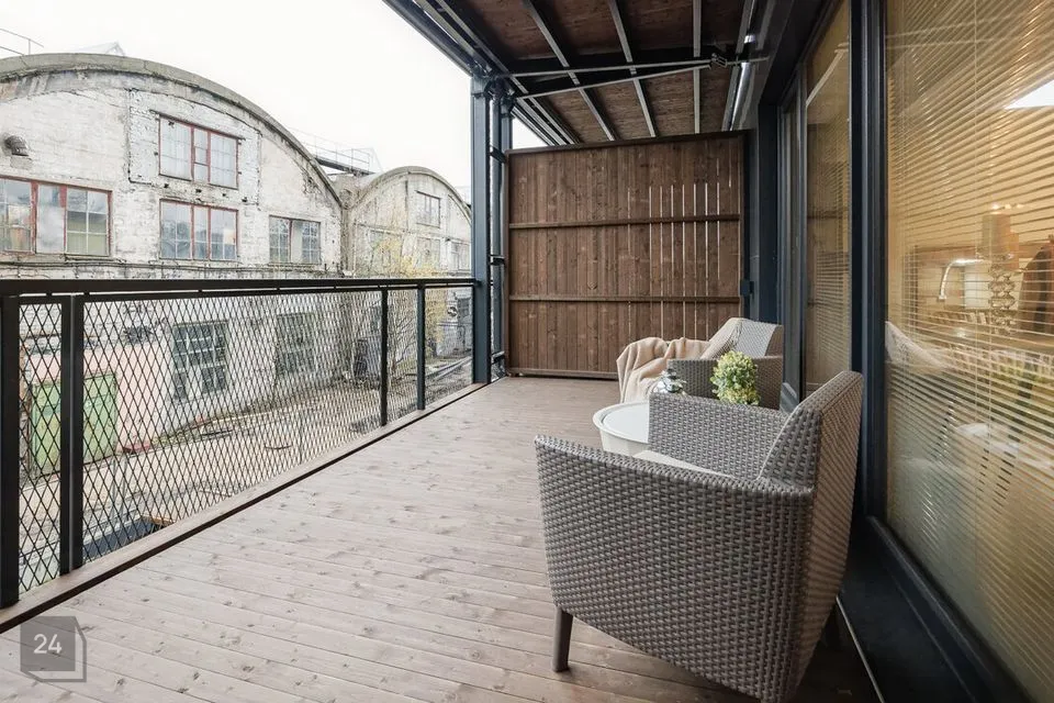 Maast laeni aken ja kõrge lagi annavad korterile avarust ja valgust, magamisala on eraldatud vaheseinaga. Boonuseks on suur, 15,5 m² lõunapoolne rõdu, kus saab mõnusalt aega veeta. Aknast paistavad 1913.a. ehitatud ja alates 2007. aastast muinsuskaitse all olevad, restaureerimist ootavad angaarid.