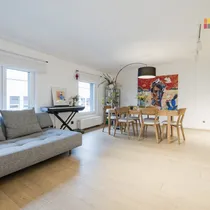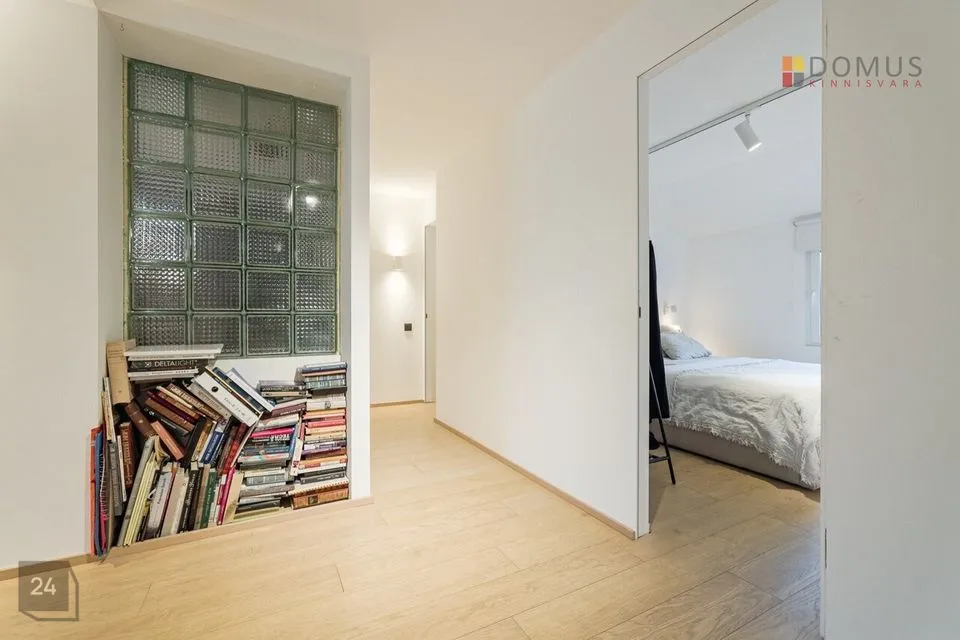 Korteri planeering koosneb suurest sissepääsu alast (esik), mis on varustatud kvaliteetsest vineerist garderoobkappidega ning tehnilise alaga, seejärel koridorist, millest pääseb avatud köögiga elutuppa ja magamistubadesse, samuti ka sanitaarruumidesse, kus on lisaks vannitoa/wc-le ka hubane ja mugav leiliruum. Korter on väga valgusküllane, soe ja vaikne. Magamistubade aknad avanevad sisehoovi hommikuse päikese poole. Ülevalt pole naabreid, nii et vaikus on garanteeritud. Korteris on tänu ainulaadsele asukohale päeva jooksul alati valgus. Korteri planeering on kahele poole maja.