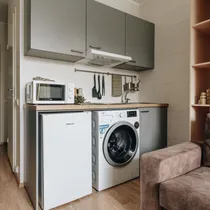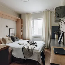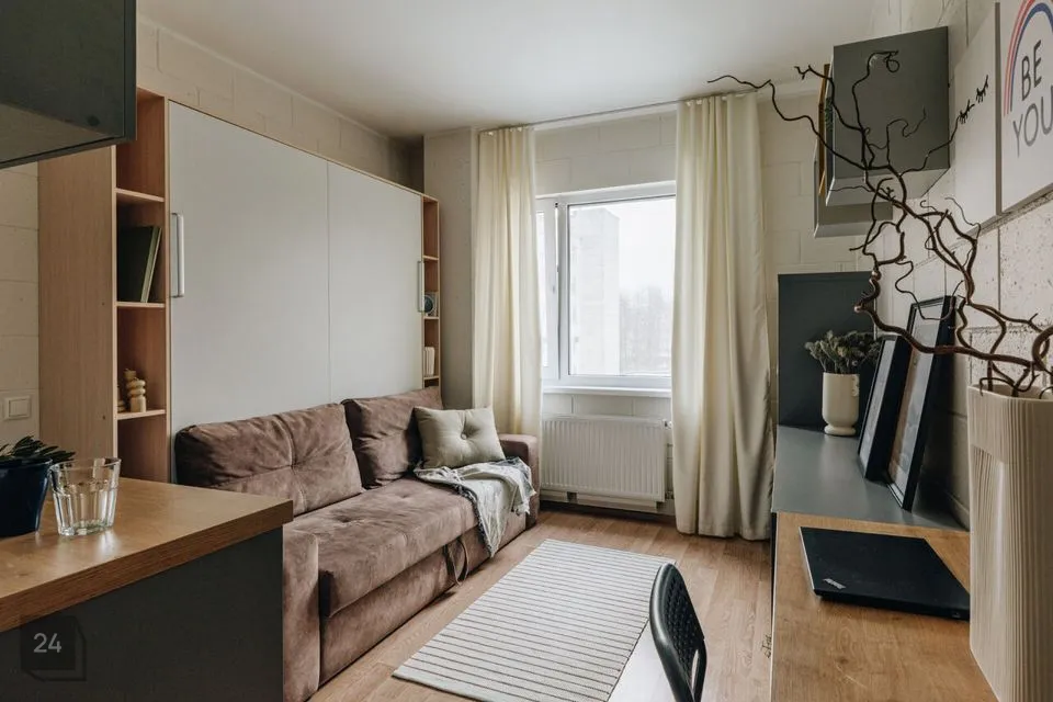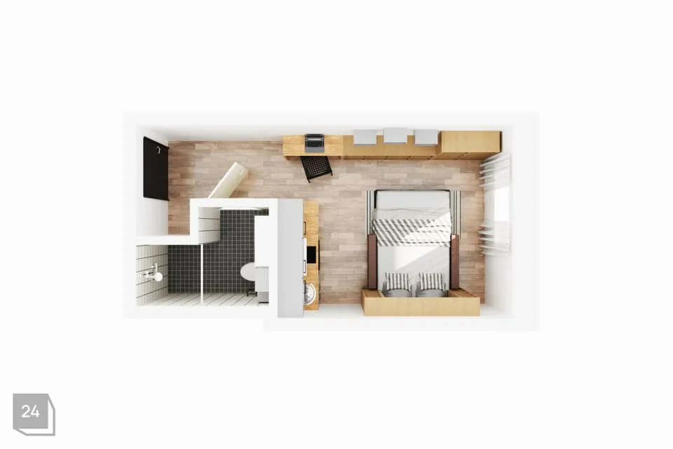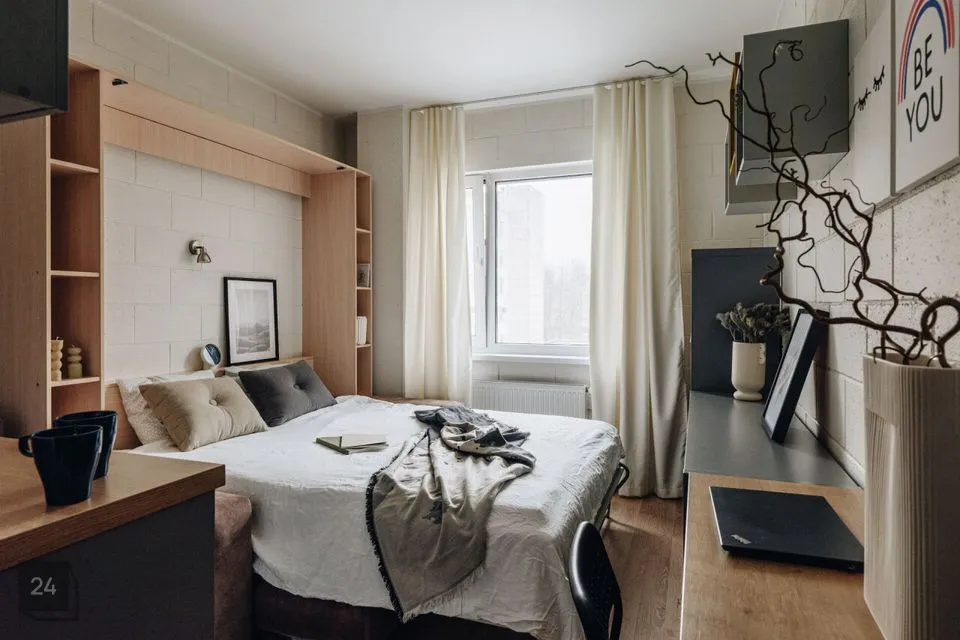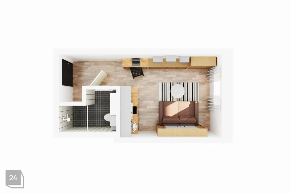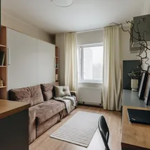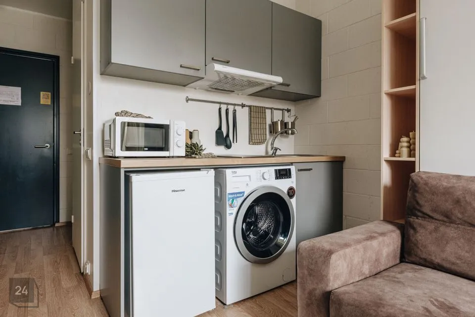 Hele ja stiilne 16 m² stuudio, kus kompaktne disain kohtub mugavusega. Toas on kaasaegne kööginurk külmiku, pliidi ja mikrolaineahjuga, privaatne vannituba ning mitmeotstarbeline kokkuvolditav voodi, mis säästab päevasel ajal ruumi. Läbimõeldud panipaigad, soojad detailid ja rohkelt loomulikku valgust muudavad selle praktiliseks, kuid hubaseks koduks.