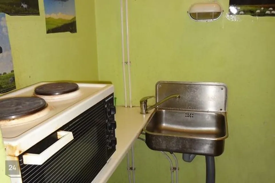 Tuba asub väikses kortermajas. Kööginurk ja duširuum on kolme toa ühiskasutuses.