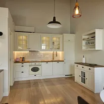 Korter on kujundatud heledates toonides, tubade põrandatel parkett, vannituba on plaaditud.