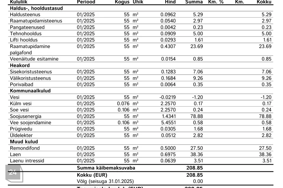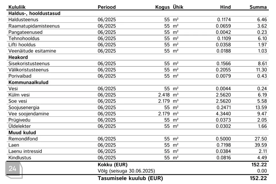 Üürile lisanduvad kommunaalmaksed (suvel 130, talvel 210 eur/kuu) ja vesi ja elekter
