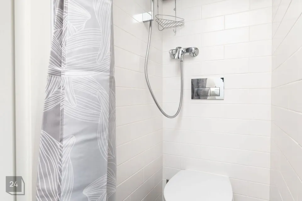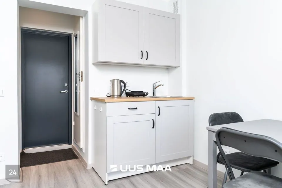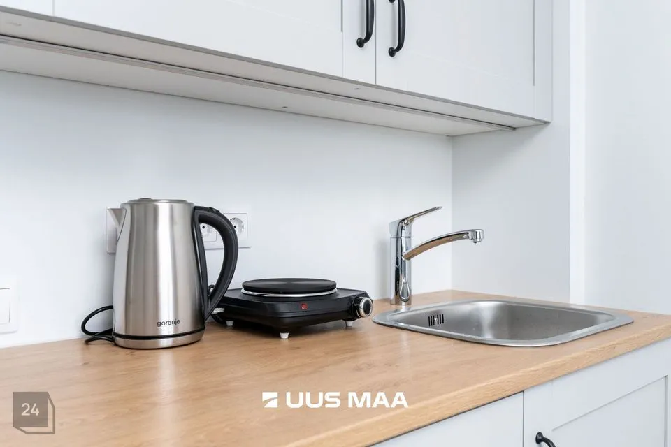 Kööginurk on kompaktselt lahendatud ja varustatud vajaliku tehnikaga, sealhulgas külmik, mikrolaineahi, elektripliit ja veekeetja. Vannituba on kaasaegne ja funktsionaalne, olemas on dušinurk, seinapealne WC ning veeboiler. Korteris on heledad ja neutraalsed toonid, mis loovad avara ning hubase atmosfääri.