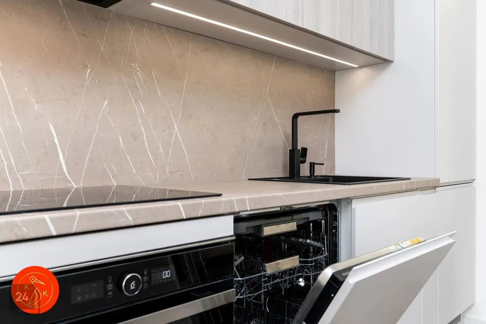 Funktsionaalsesse köögimööblisse on integreeritud kvaliteetne köögitehnika: keraamiline pliit ja toiduahi, õhupuhasti, nõudepesumasin ning külmkapp koos sügavkülmikuga.
