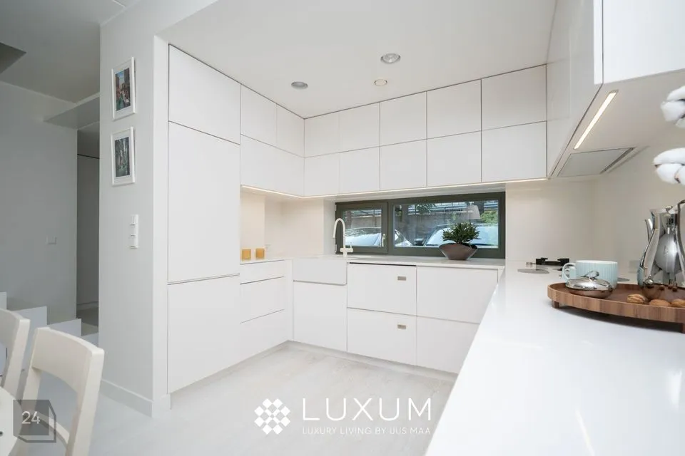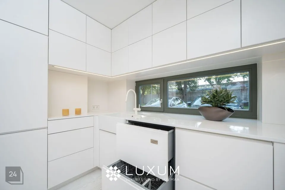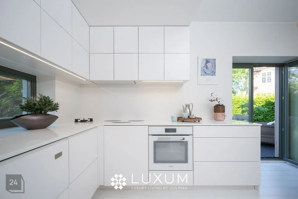 Köök on sisustatud kvaliteetse tehnikaga (pliit, ahi, õhupuhasti, nõudepesumasin, külmik) ning pakub rohkelt tööpinda ja kapiruumi.