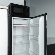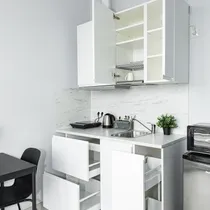 Kaasaegne köögimööbel koos tehnikaga, köögis on olemas kõik vajalik söögi tegemiseks: külmik, pliit, mikrolaineahi, teekann.