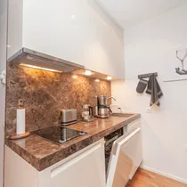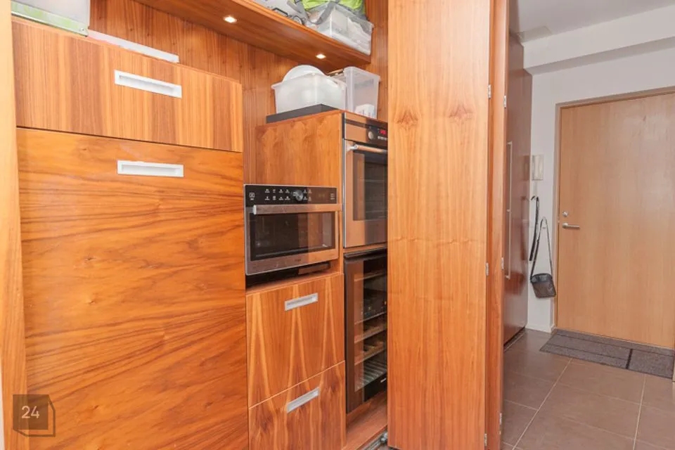 Funktsionaalsesse köögimööblisse on integreeritud kvaliteetne köögitehnika: nõudepesumasin, keraamiline pliit, toiduahi, õhupuhasti, külmkapp, mikrolaineahi.