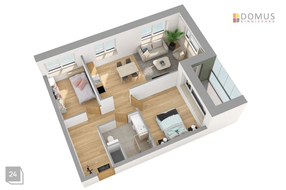 3-toalline korter on 58,9 m², millele lisandub rõdu 4,7 m². Rõdu on kinnine klaasidega. Korteri juurde kuulub panipaik 2,5 m².