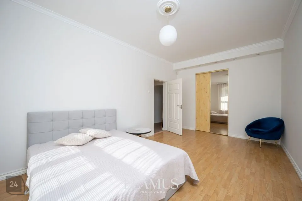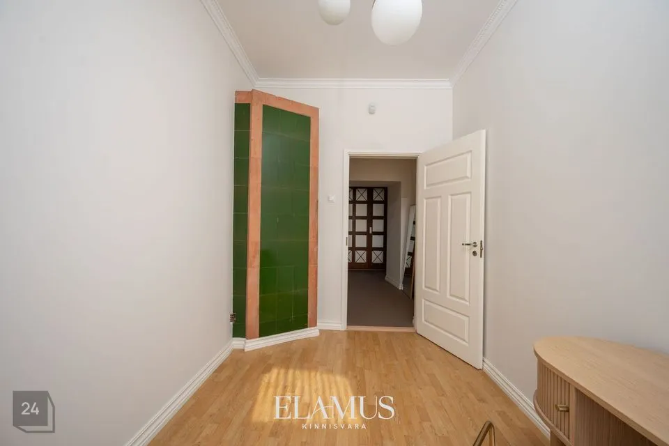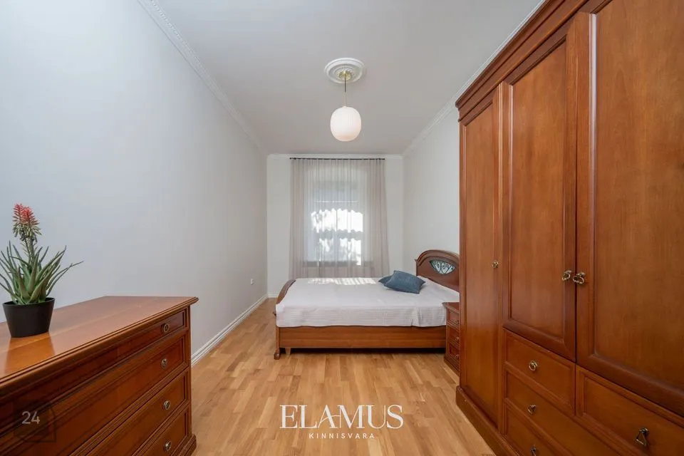 Korter (104,1 m²) asub esimesel korrusel ning on varustatud naturaalsest puidust parketiga, mis lisab interjöörile soojust ja väärikust.