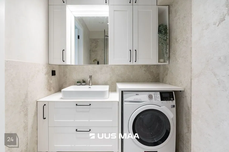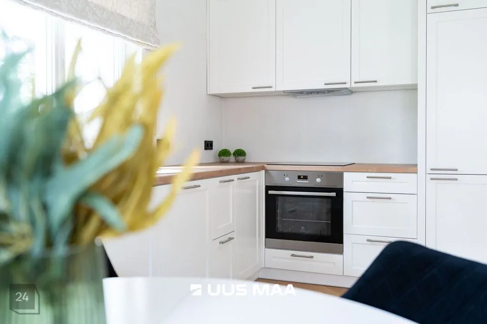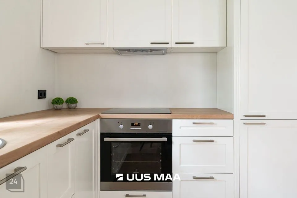 Köök on väga funktsionaalne ning köögimööblisse on integreeritud kvaliteetne köögitehnika: induktsioonpliit, toiduahi, õhupuhasti, külmkapp koos sügavkülmikuga ning nõudepesumasin.