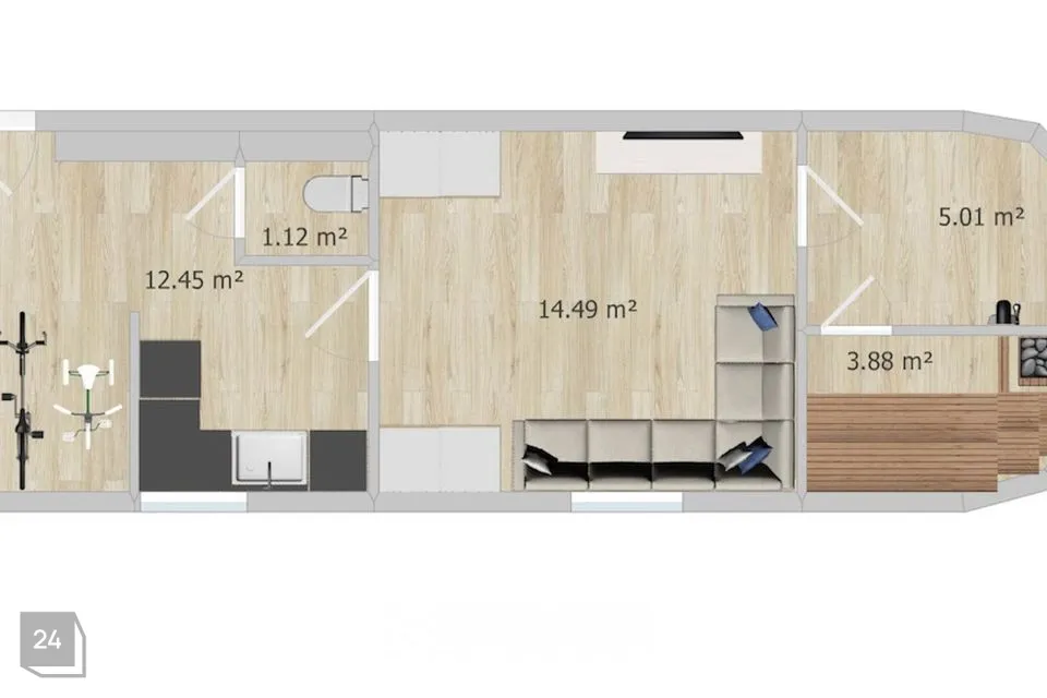 Korteri üldpind on 126 m² (kõrge esimene korrus 91,2 m² + kõrge soklikorrus 35,5 m²). Ülemisel tasapinnal on kaks magamistuba, valgusküllane elutuba, köök, eraldi söögituba ning vannituba ja tualett. Alumisel tasapinnal asub eraldi sissepääsuga korteri osa, kus on köök-elutuba, panipaik, saun koos dušiga ja tualett – paindlik ruum külaliste majutuseks, teismelise privaatsfääriks või kodukontoriks.
