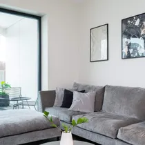 В квартире - гостиная с открытой кухней, просторный коридор с вместительным гардеробом, 2 спальни и 2 санузла. В ванной комнате есть стиральная и сушильная машины. Квартира оснащена системой "умный дом", с помощью которой можно эффективно управлять домом через смартфон. Во внутреннем дворе дома находится теннисный корт и детская площадка. Все необходимое для жизни в квартире есть.