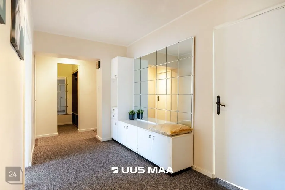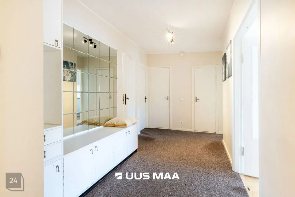 Korteri koosseisu kuulub esik koos mahuka garderoobiga; elutuba pääsuga klaasitud rõdule; kaks magamistuba ja kabinet (võimalik kasutada kolmanda magamistoana); eraldi vannituba ja WC.