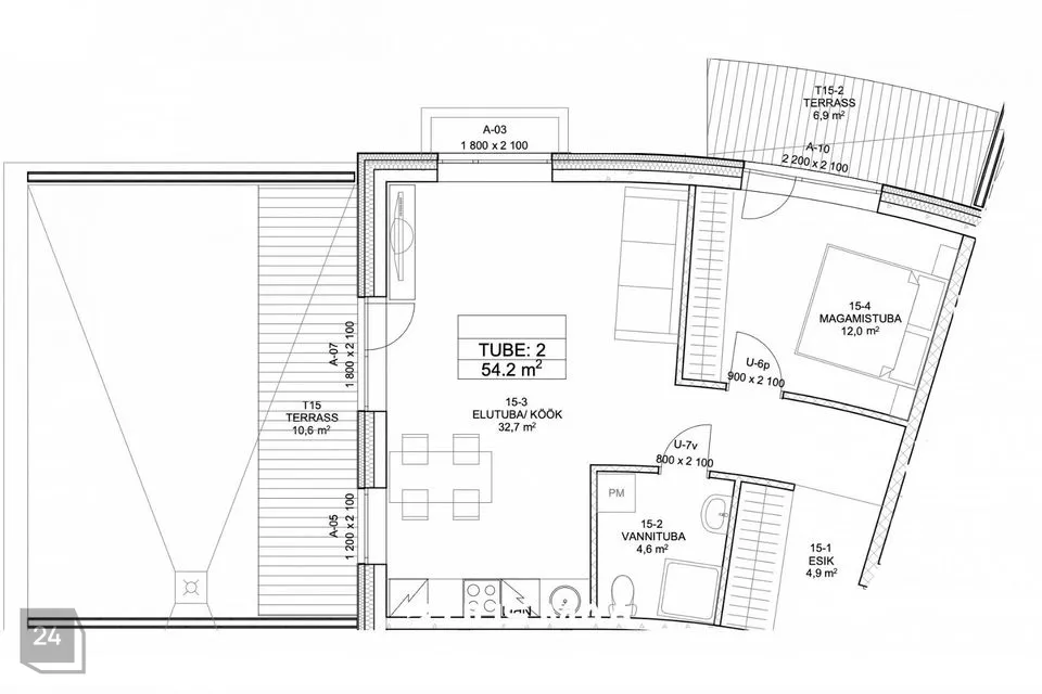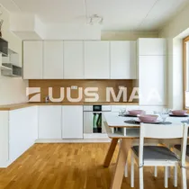 Üürile anda unikaalse arhitektuuriga poolringmajas kahe suure terrassiga 2-toaline korter Kristiine põiktänaval.