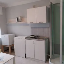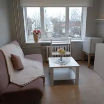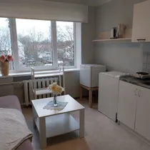 Korter on möbleeritud. Kõik, mis on fotodel, jääb üürilise kasutada. Olemas on el. pliit (lauapliit), külmik, pesumasin, diivanvoodi, diivanilaud, köögikapid ja riiul. Korter on puhas ja korras, soe, vaikne. Aken avaneb sisehoovi poole, rohelusse.