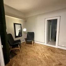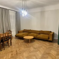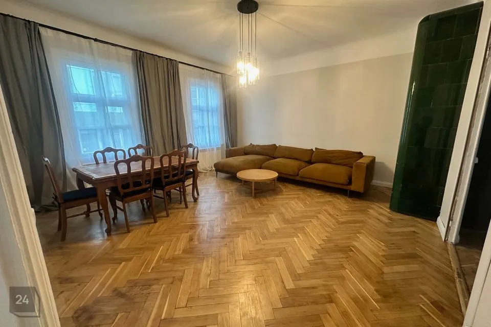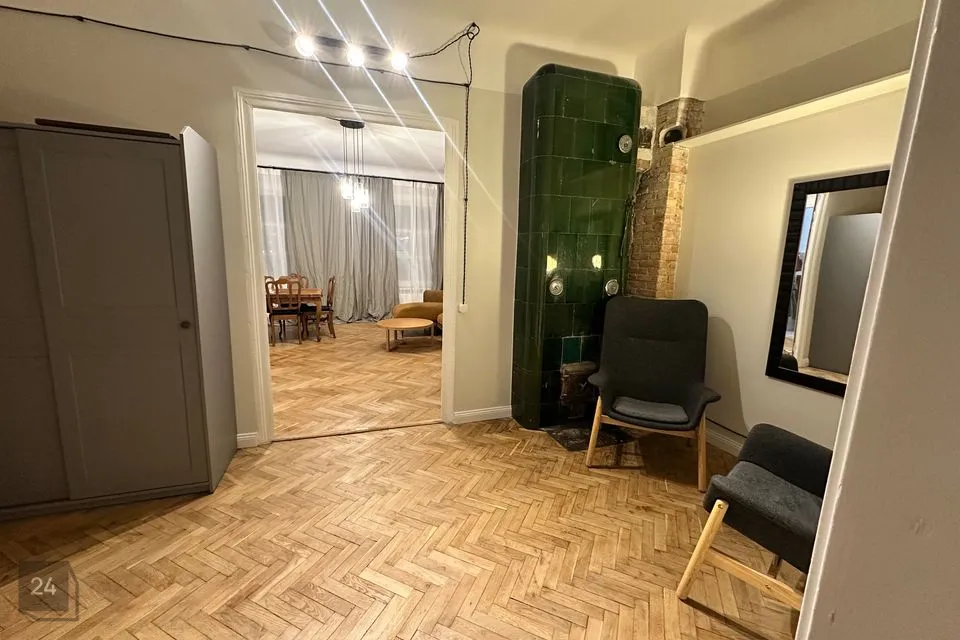 Magamistoa põrandat katab naturaalne vaipkate, teistes tubades on puhastatud ja õlitatud algupärane kalasabaparkett. Korteris on parasjagu mugavaks äraolemiseks vajalikku mööblit. Sh 160 cm voodi ja kummut magamistoas, riidekapp ja mõnusad tugitoolid vahetoas, erakordselt suur ja mugav diivan elutoas. Lisaks söögilaud ja kuus tooli.