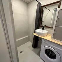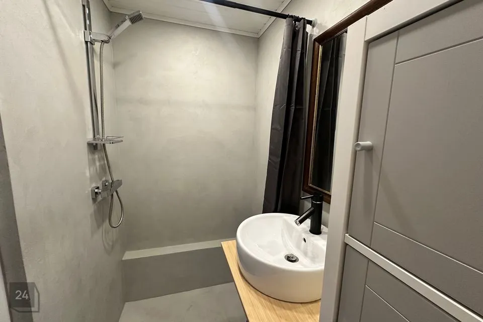 Vannituba katab jala all mõnus ja lihtsasti hooldatav mikrotsement ning sinna on mahutatud ka tutikas pesumasin.
