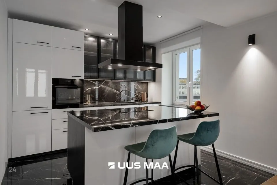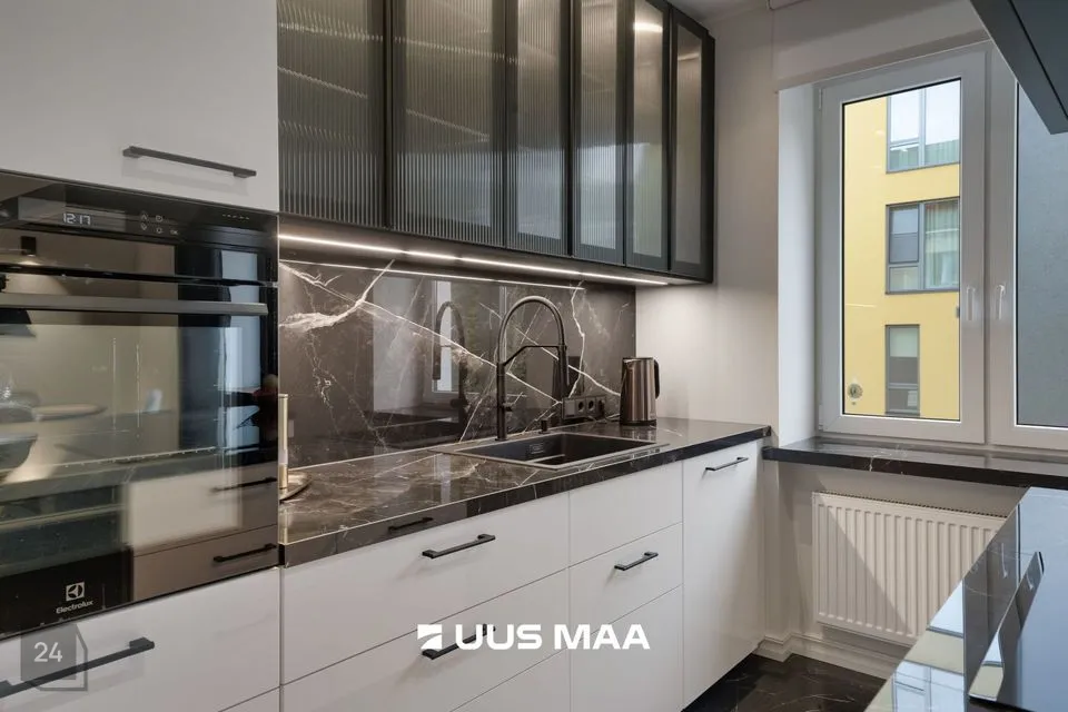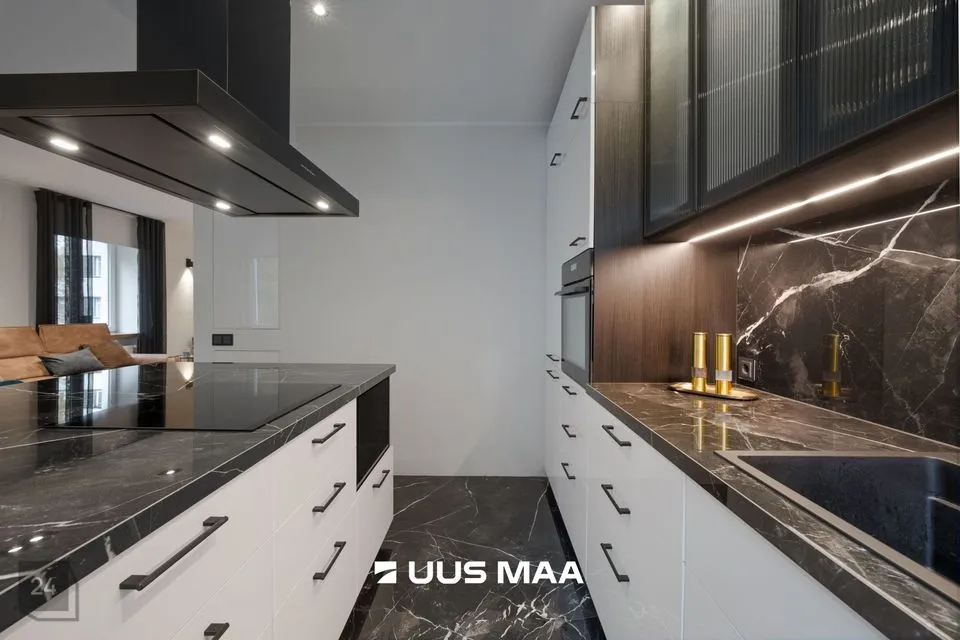 Elutuba on avatud ja kutsuv, ühendatud maitsekalt kujundatud köögiga, kus kvaliteetne mööbel ja köögisaar moodustavad loomuliku keskpunkti. Köögi põrand on kaetud kauni keraamilsie plaadiga ning varustatud põrandaküttega.
