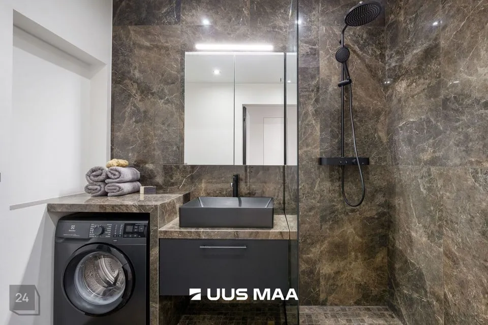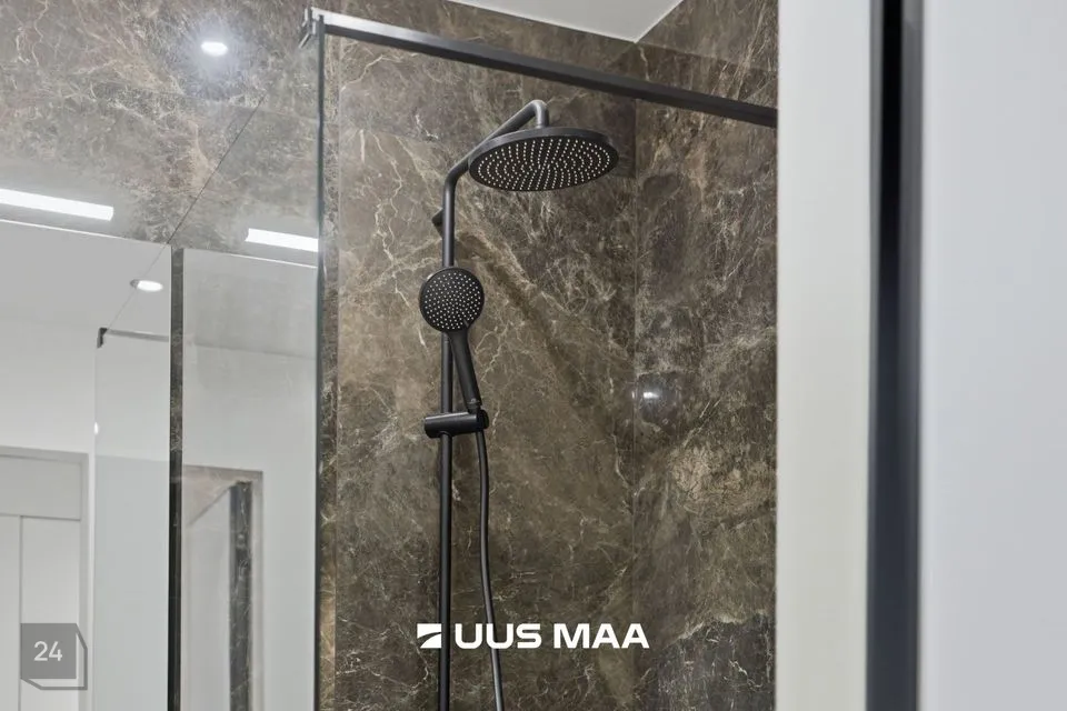 Vannituba pakub mugavust ja elegantsi – avar dušinurk, hoolikalt valitud plaadid ja põrandaküte, mis lisab igasse hommikusse soojust.