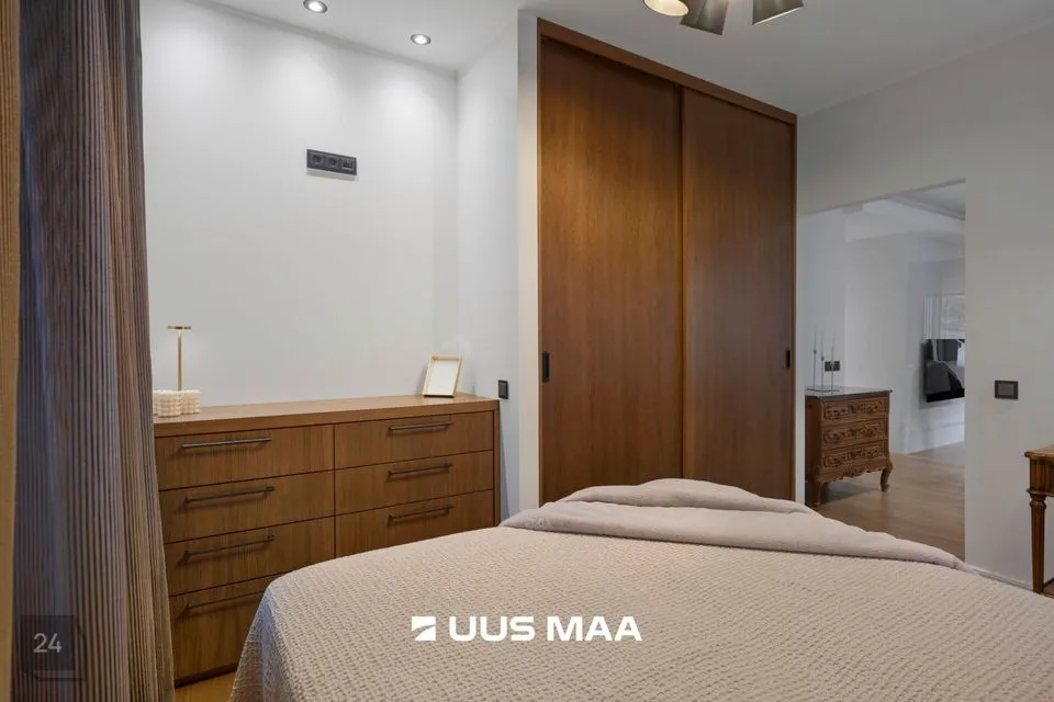Magamistuba on rahulik ja hubane, sisustatud luksusliku voodi ja mahuka riidekapiga.