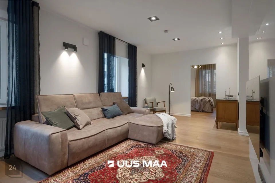 Põrandaid katab naturaalne puitparkett, mille toon toob ruumidesse soojust ja väärikust.