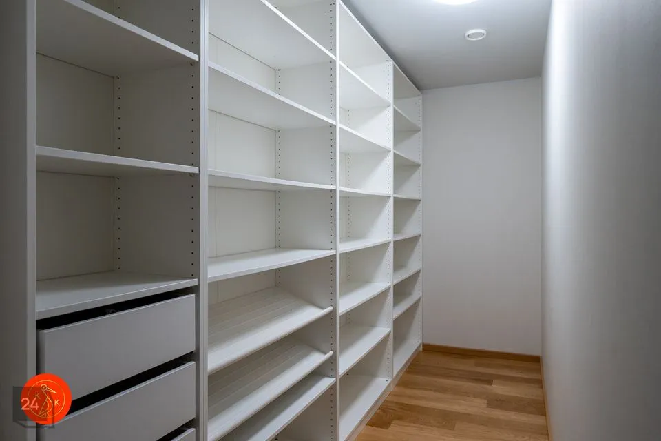 Korteri panipaigas on suur seinast seinani ulatuv avatud riiulite ja sahtlitega kapp.