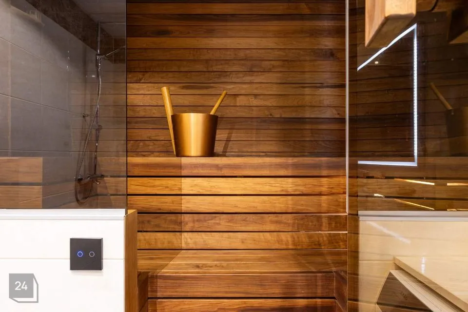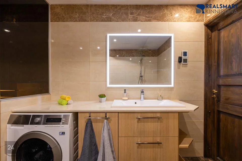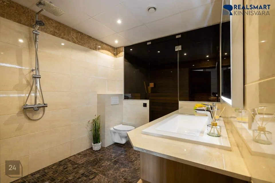 Viimase võimalusena pääseb avatud kööginurgast vannituppa. WC ja vannituba on koos. Vannitoas on võimalik kasutada vajadusel ka elektrilist põrandakütet. Vannitoas on kuivatusfunktsiooniga 2in1 pesumasin. Kõnealuse korteri pärliks saab pidada mahukat ja hubast sauna leiliruumi, mis annab korterile lisaväärtust.