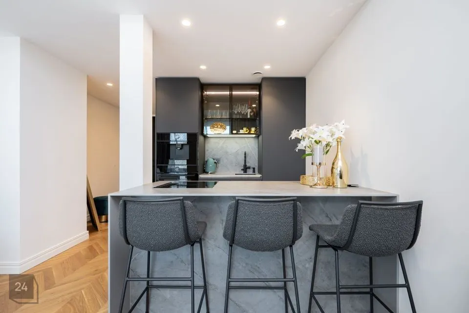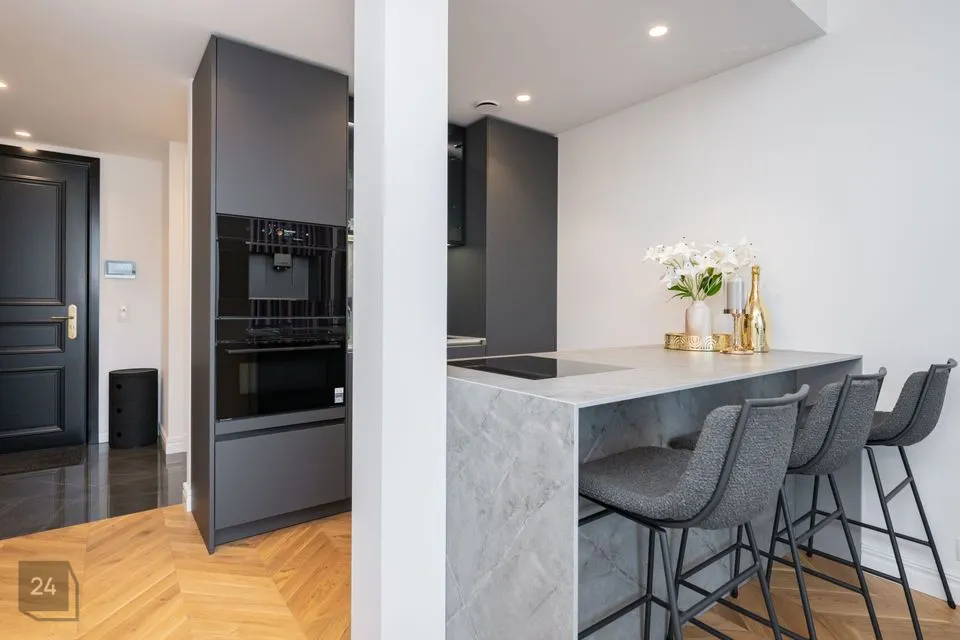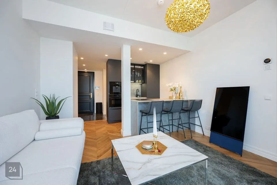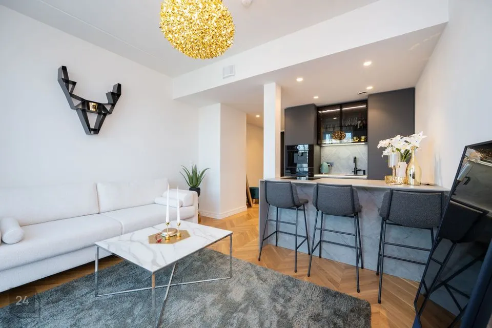 Korter on täielikult sisustatud – kvaliteetne mööbel, moodsad kodumasinad ja hoolikalt valitud detailid loovad luksusliku, ent koduse atmosfääri.