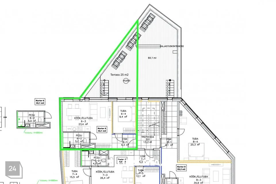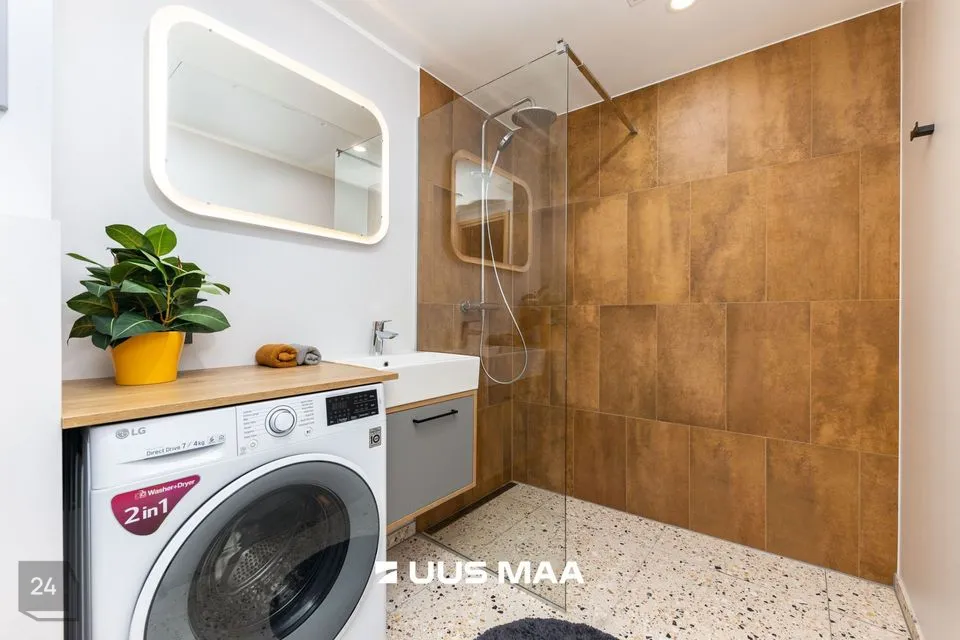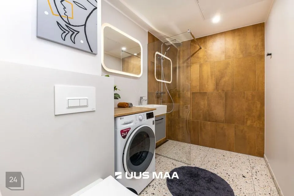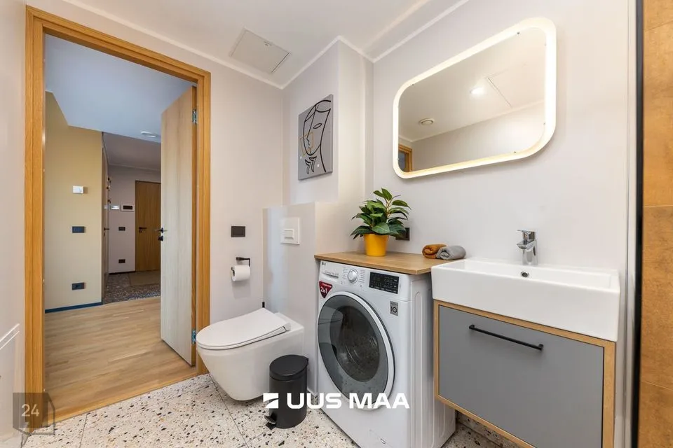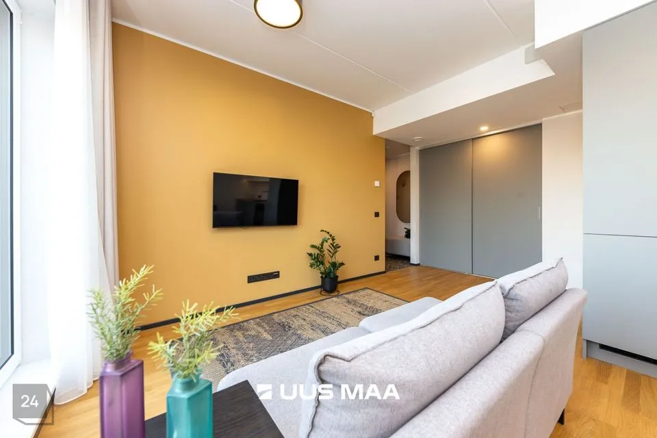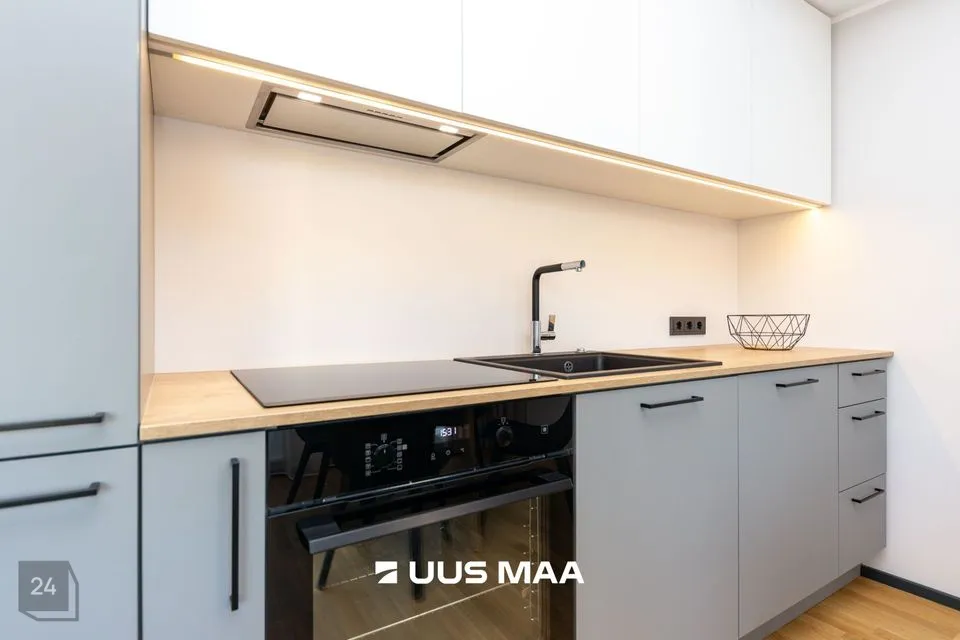 Ruumide koosseisu kuulub: esik, valgusküllane köök-elutuba, magamistuba, avar vannituba ja suur rõdu (25 m2). Kvaliteetne köögimööbel on varustatud kogu vajamineva tehnikaga (s.h. nõudepesumasinaga).