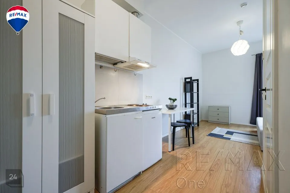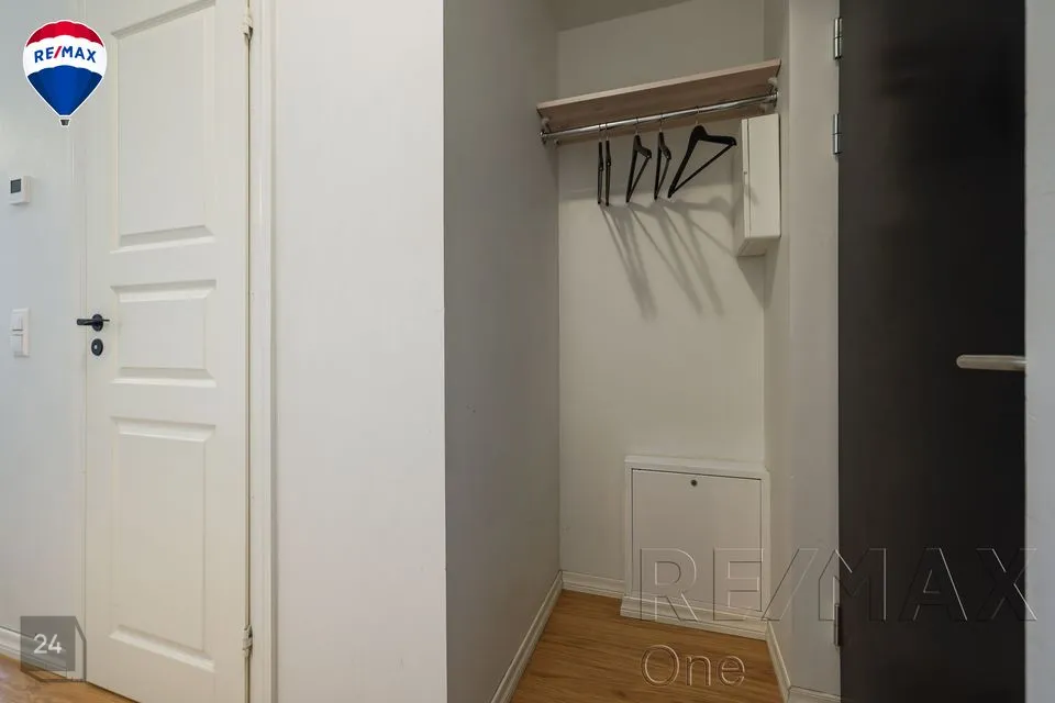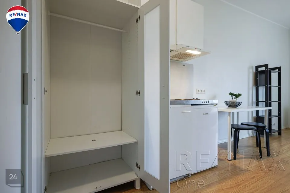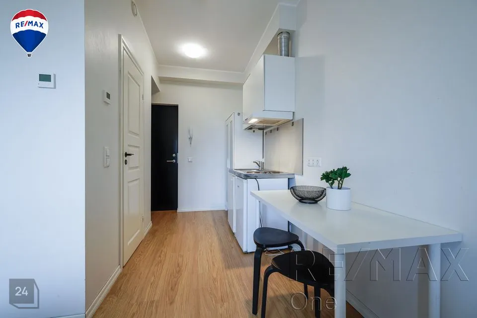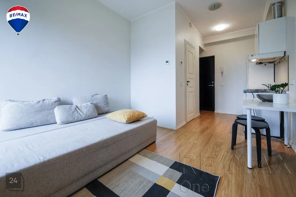 Kõrge akna ja ilusa vaatega nutikasse hubasesse väikekorterisse on mahutatud kõik olulisem - lahtikäiv diivan, riidekapp, kummut, nagi üleriiete jaoks, köögimööbel koos tehnikaga (elektripliit, külmkapp koos väikese sügavkülmikuga), väike diivanilaud ning söögilaud kahe tooliga.